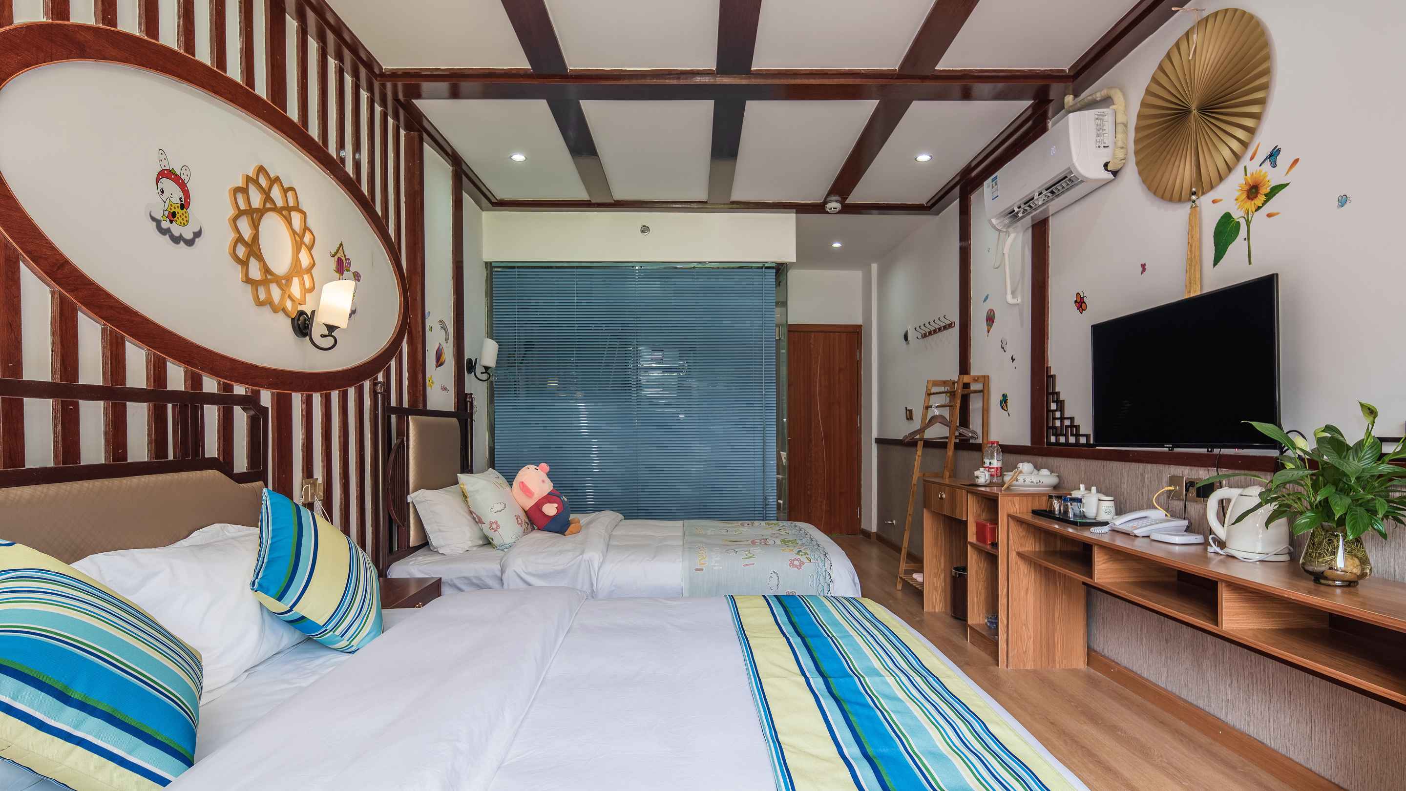 便利设施:多种规格电源插座,单一规格电源插座110V电压插座,220V电压插座、空调、客房WIFI,衣柜衣橱,遮光窗帘,电视机、电热水壶、针线包、智能门锁、雨伞、